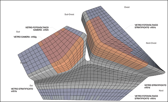 La carpenteria metallica è completata da un'orditura secondaria in profili tubolari circolari e da nodi di collegamento realizzati con giunti nascosti. La definizione della tipologia di vetro impiegato nelle differenti porzioni di superficie è stata particolarmente accurata: circa 2.000 fissaggi puntali sono stati studiati ad hoc per sostenere vetri stratificati, vetrocamera ed elementi fotovoltaici planari o curvi.